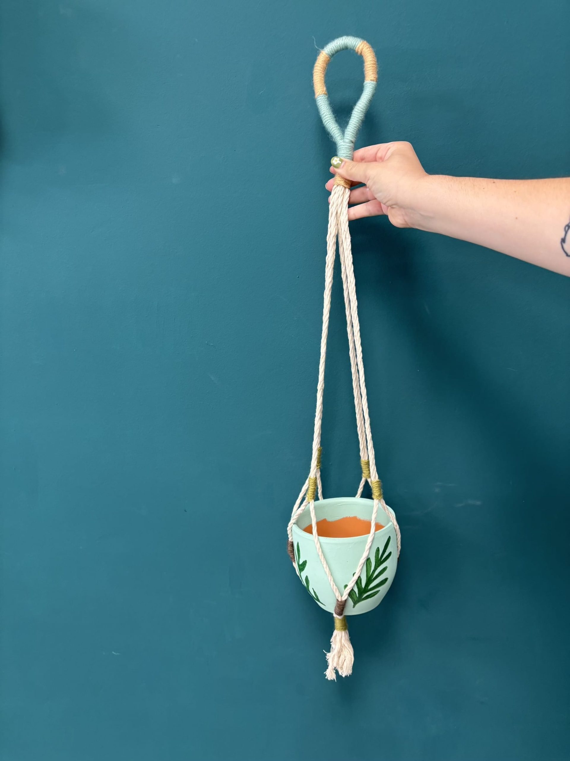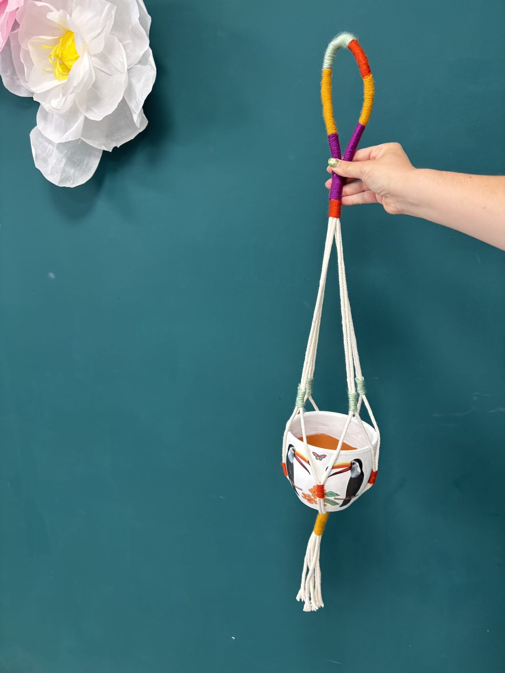Cread un colgador de macetas de macramé y decorad una maceta a juego