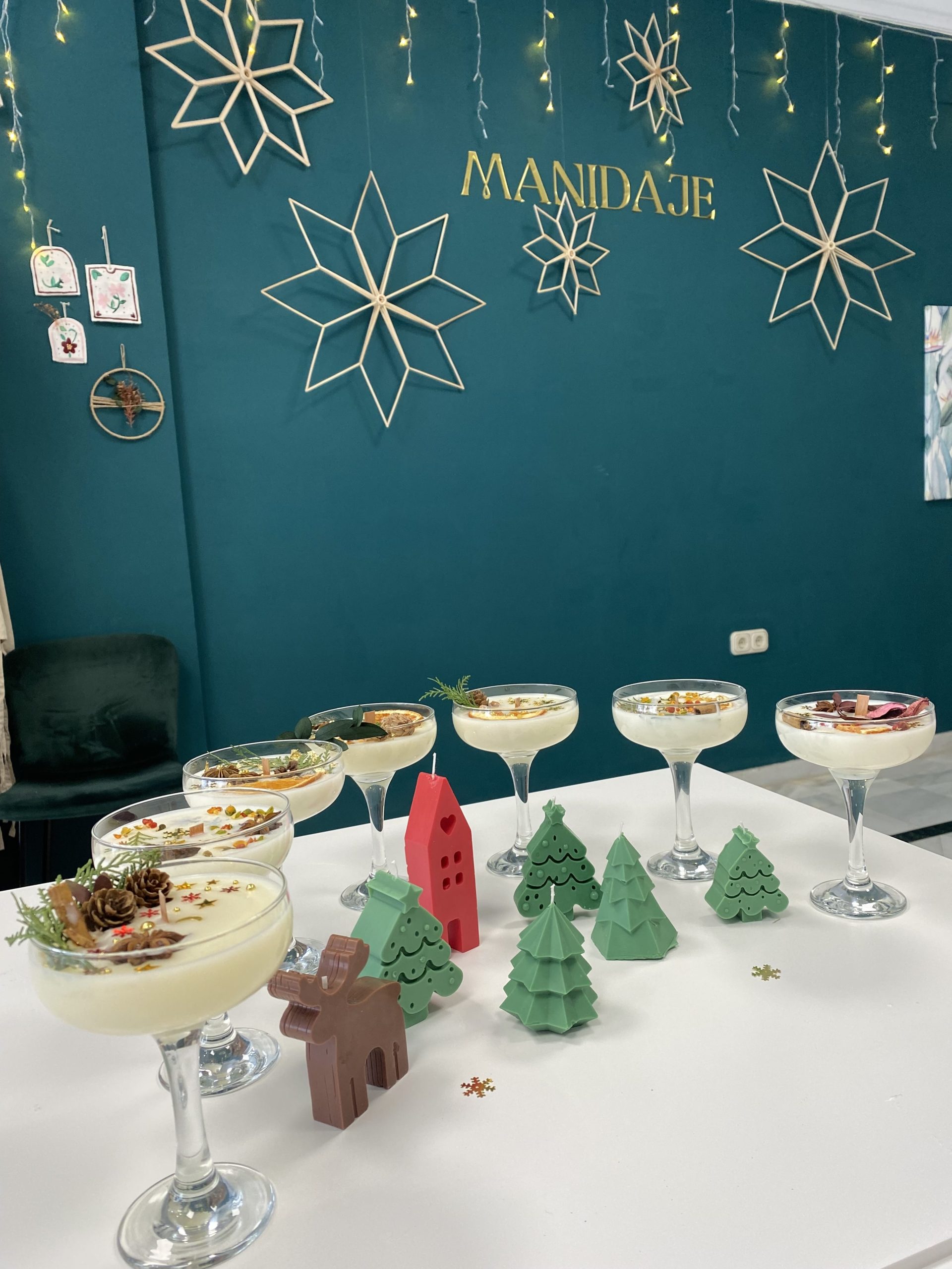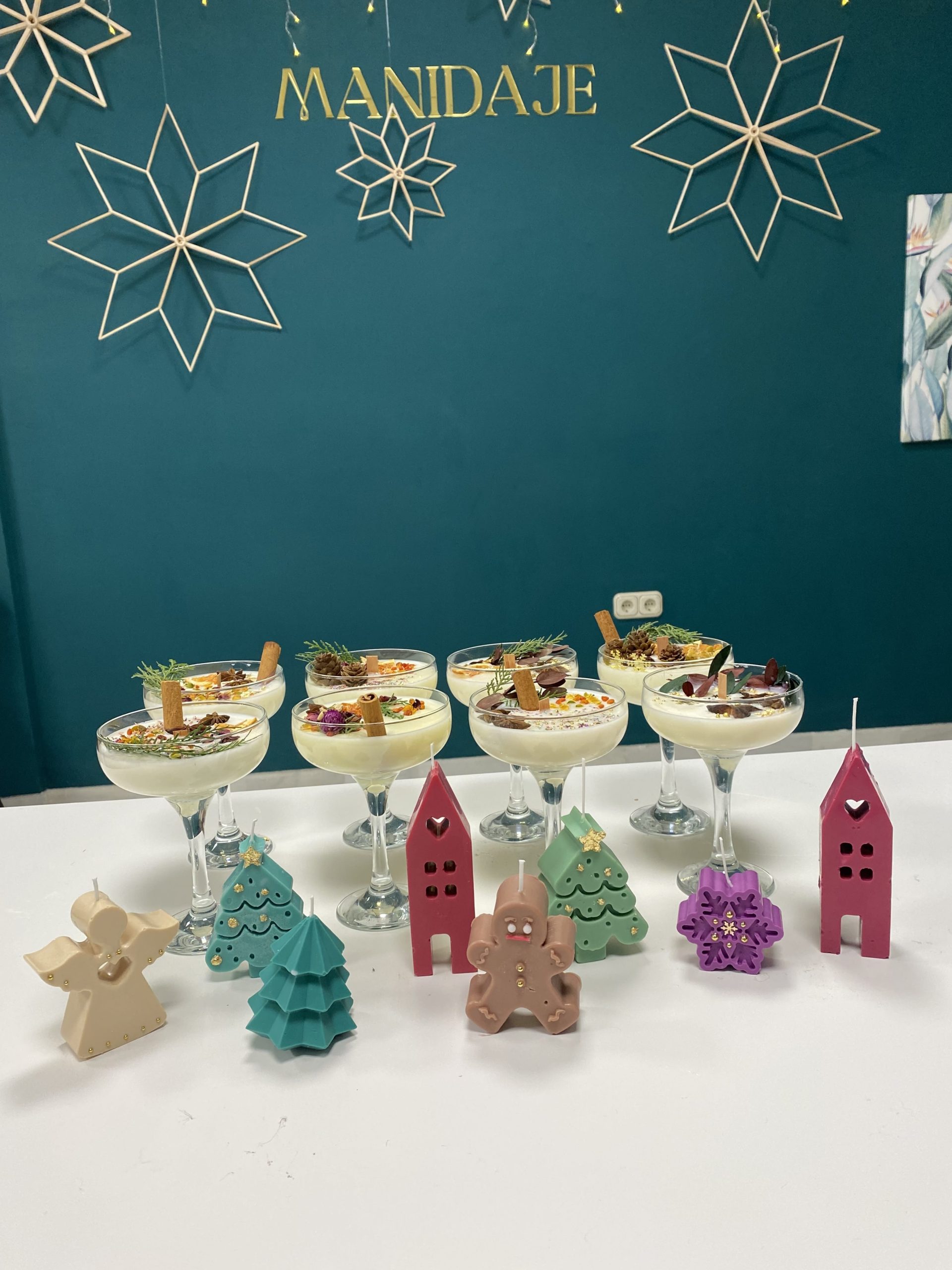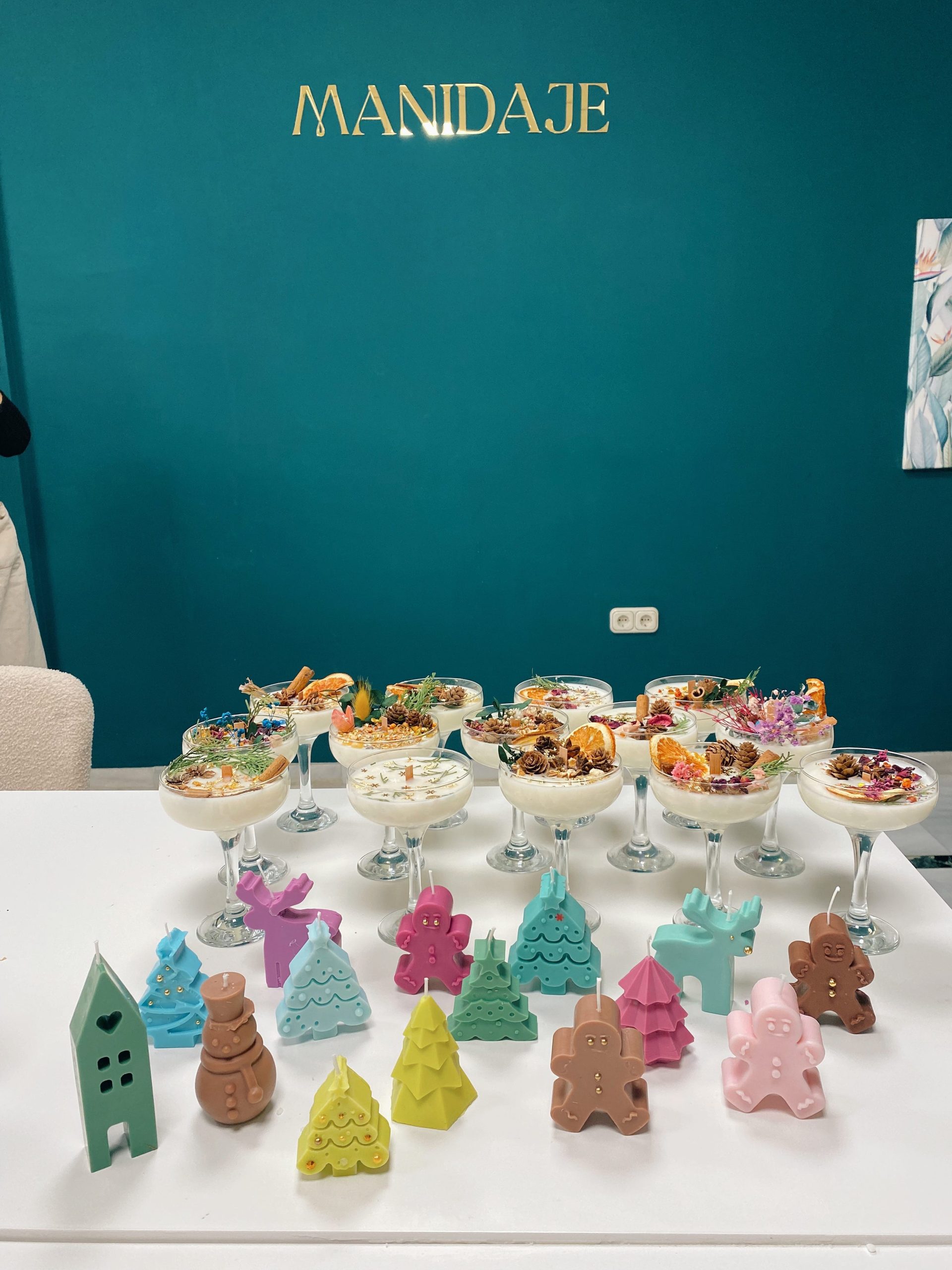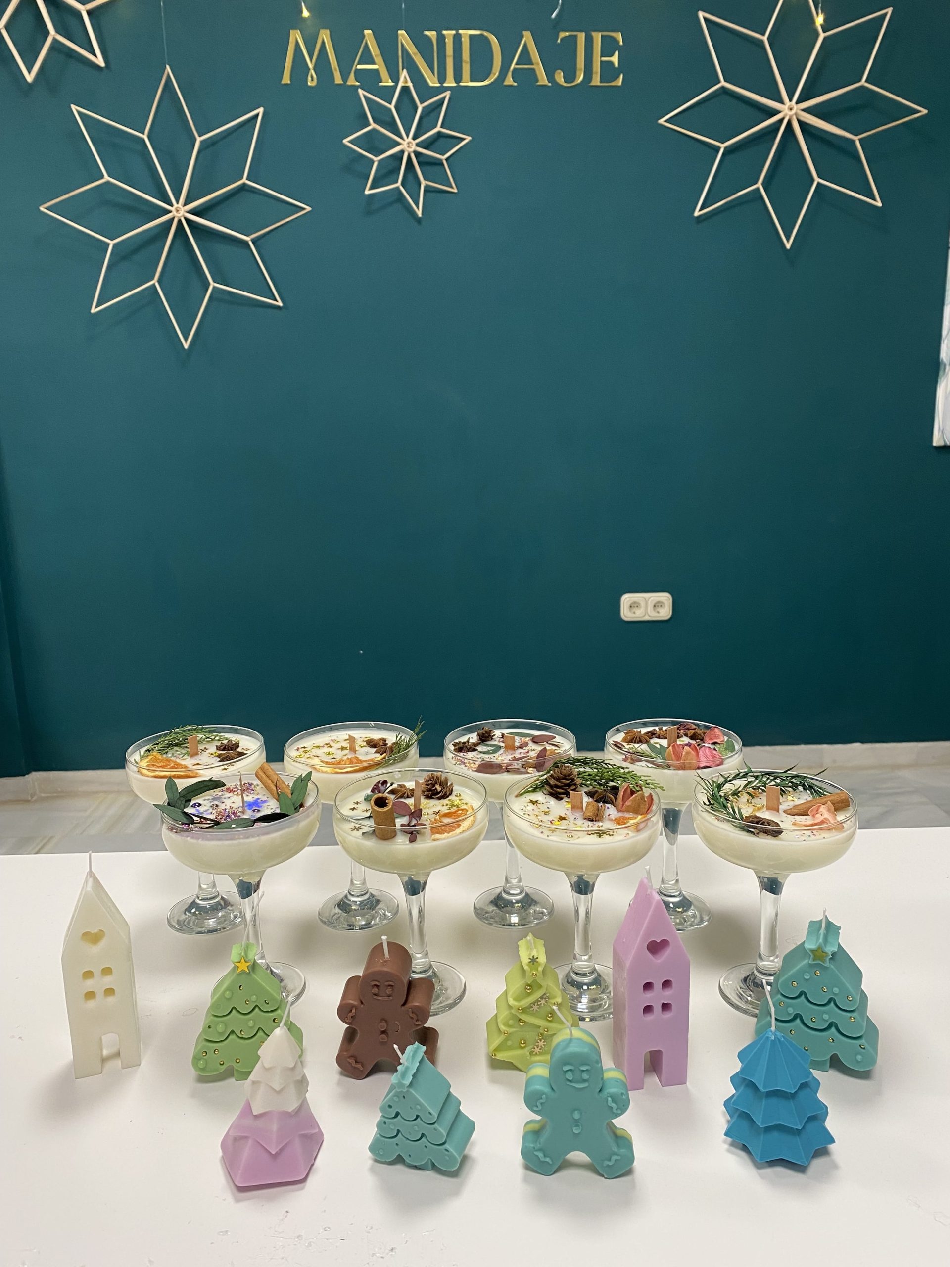 Vamos a hacer esta versión festiva de nuestras clásicas velas. La vela de molde tendrá motivos navideños (arbolito, galleta de jengibre, casita…) y la vela en recipiente la haremos en una preciosa copa y la decoraremos con muchos detalles especiales y perfectos para estas fiestas. ¡Además de aromas de Navidad!