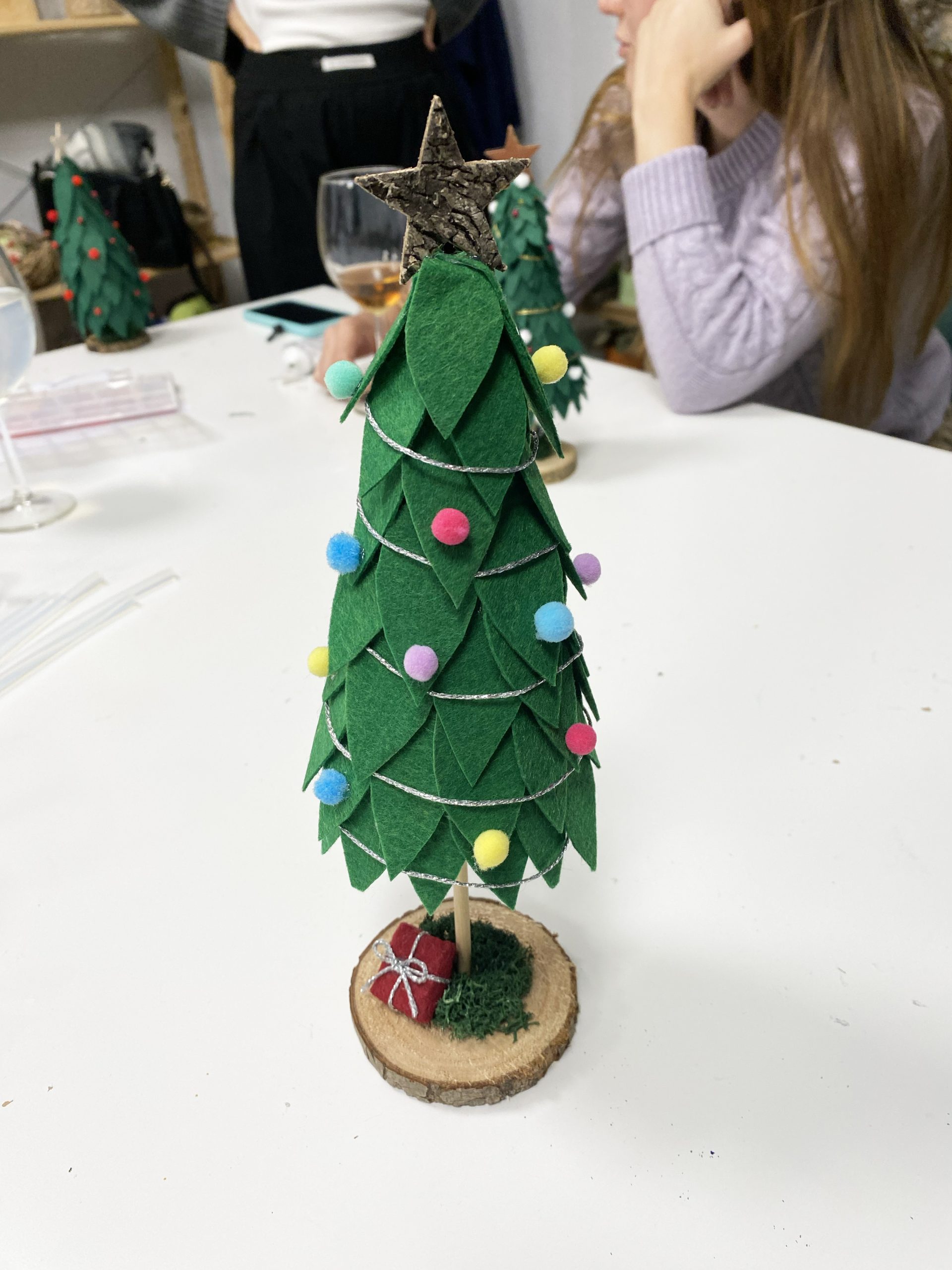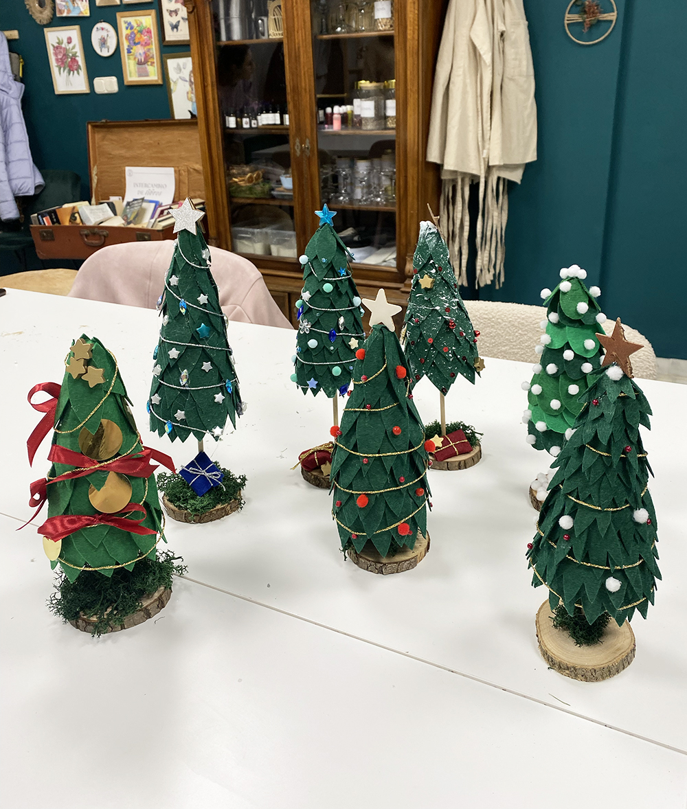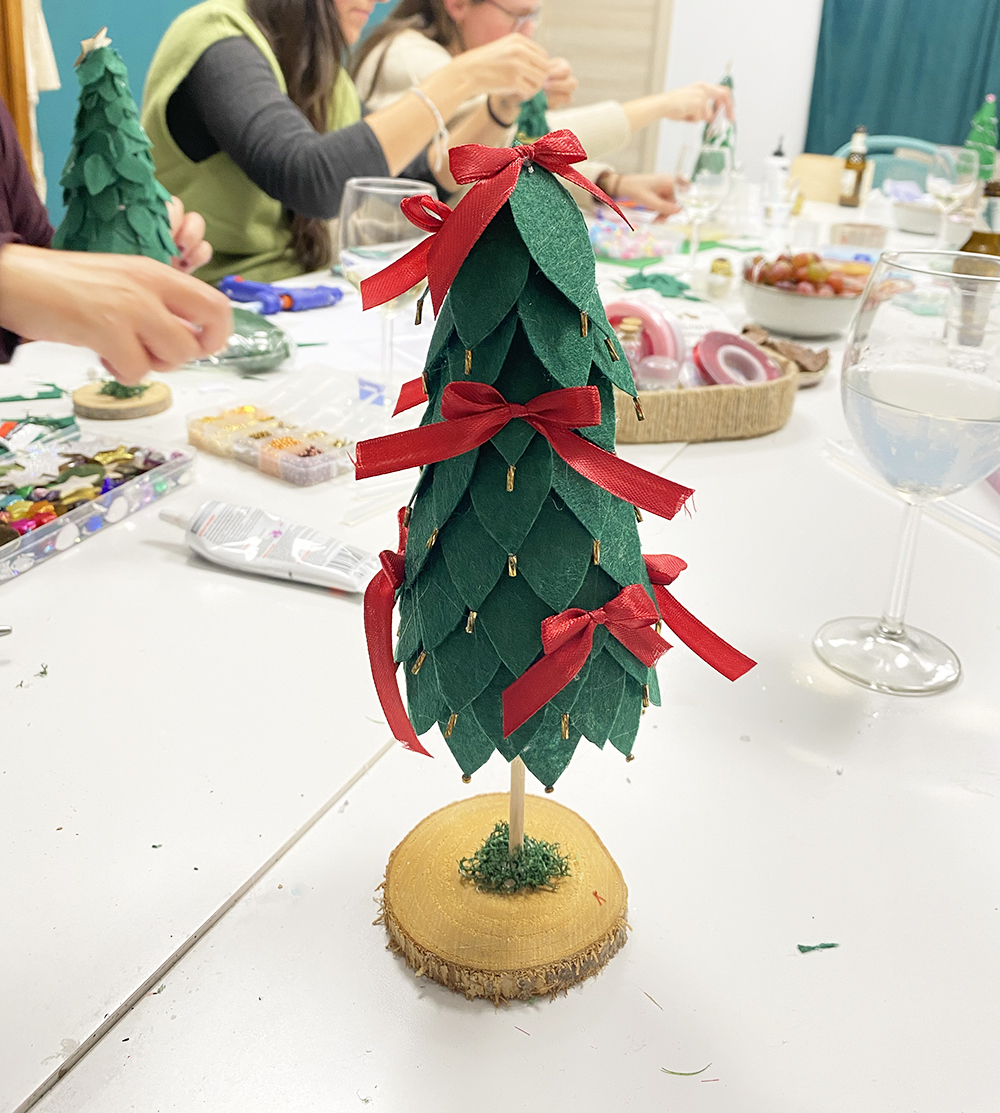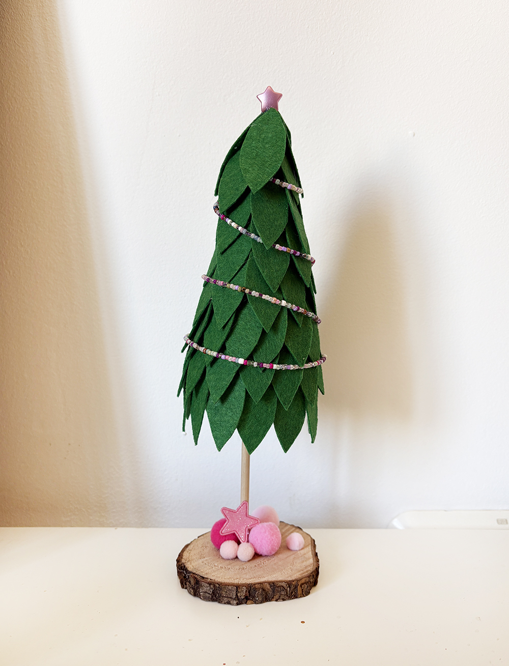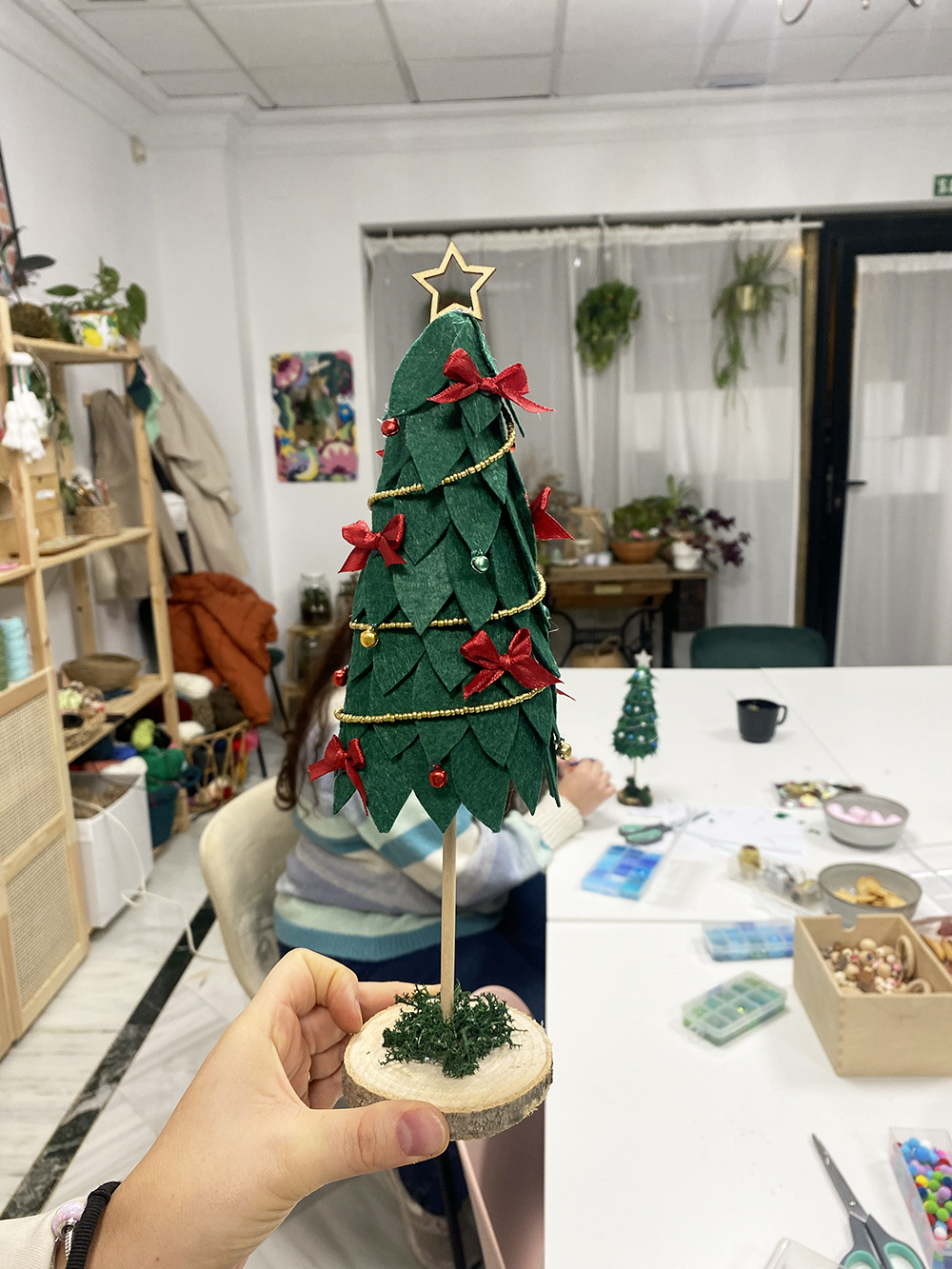 Crearéis un mini abeto de Navidad, del color que queráis, y luego adornaréis como si de uno de dos metros se tratara: guirnaldas, bolas, estrellas… ¡un sinfín de fantasías! Y sin olvidar su bonita base en rodaja de madera.