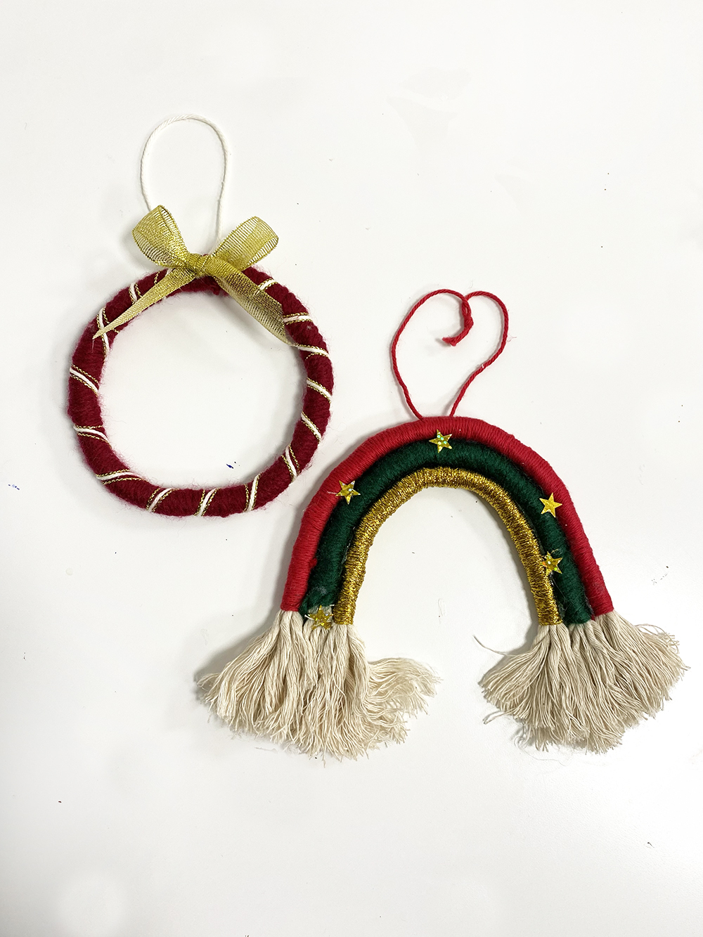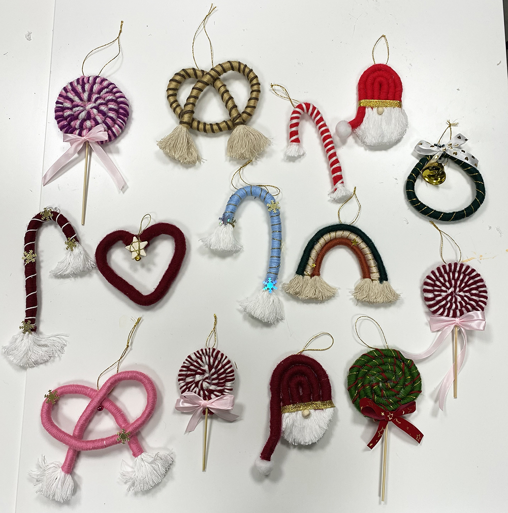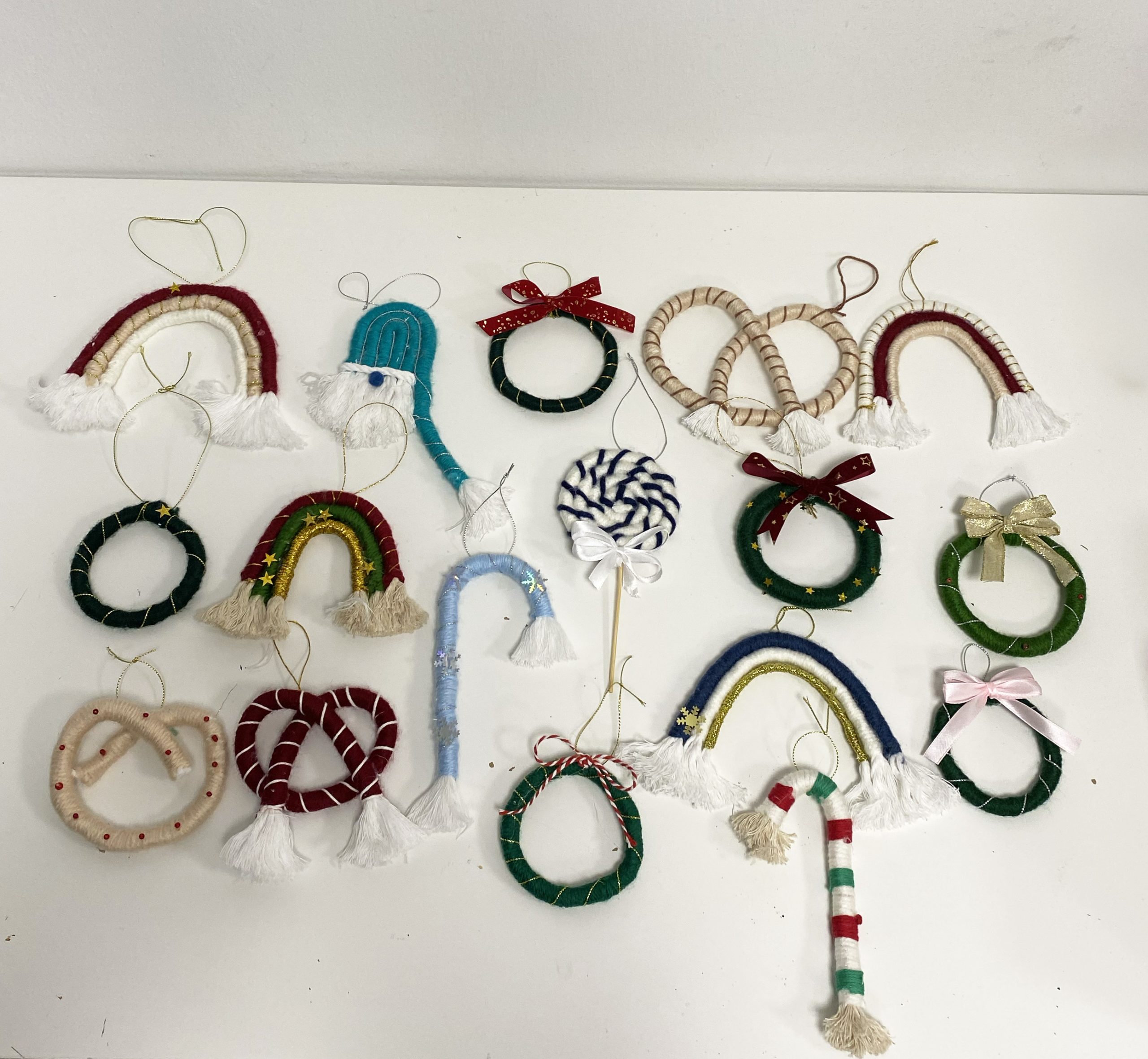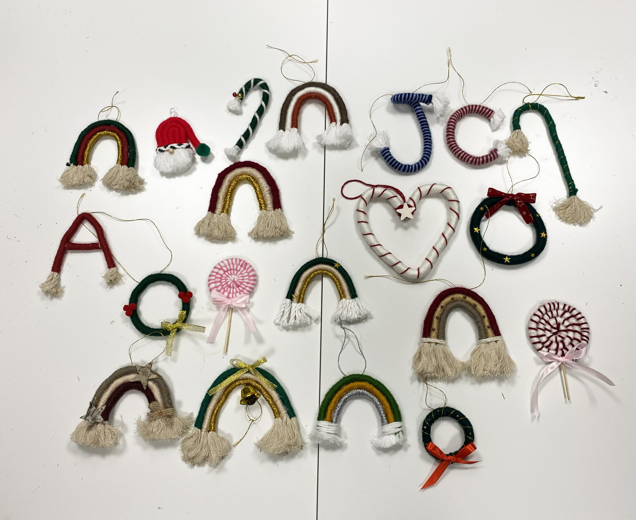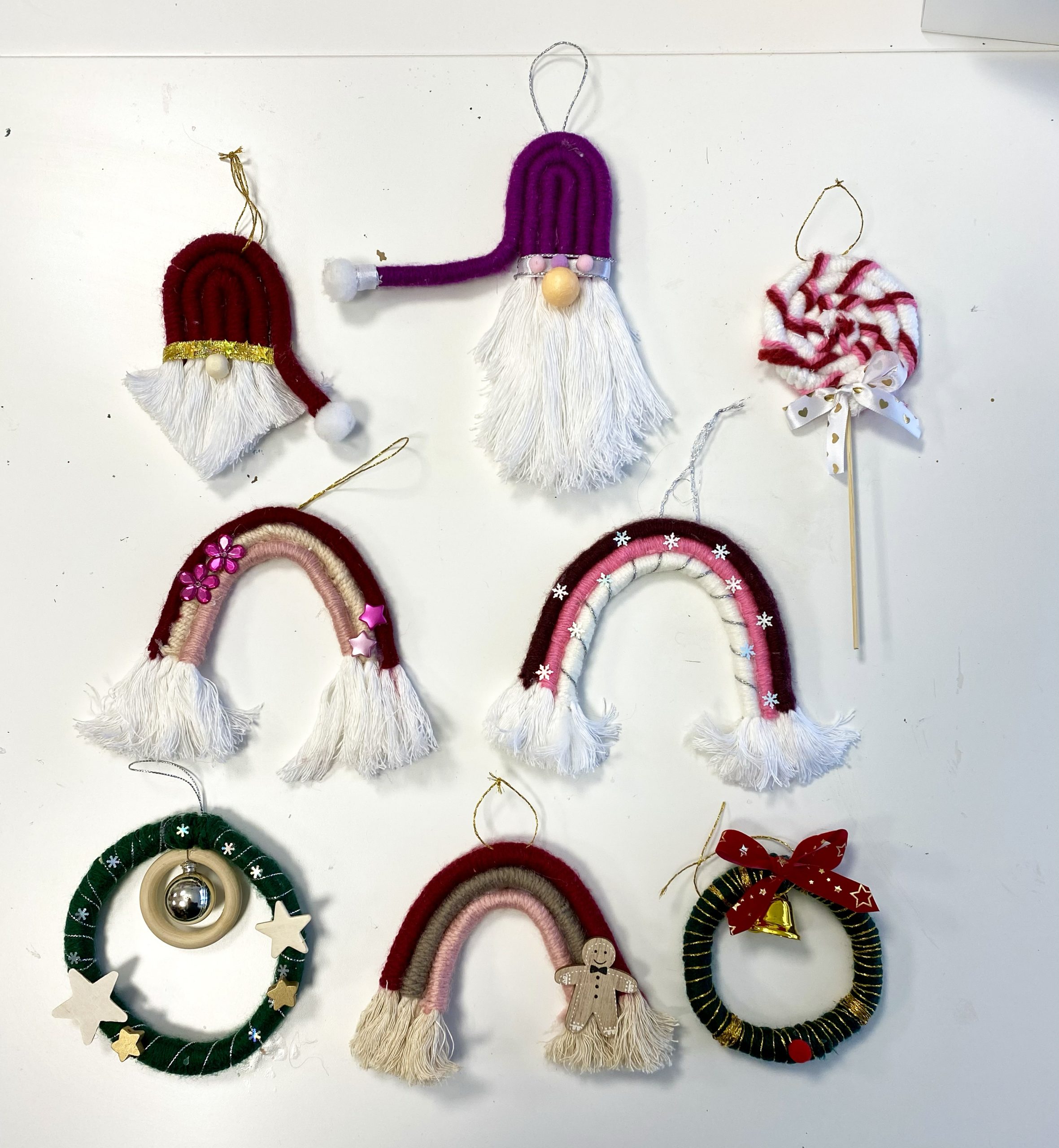 Crearéis diferentes adornos de macramé. Os dará tiempo a hacer varios en la sesión, y hay muchas formas donde podéis elegir: corazones, bastones, pretzels, arcoíris, gnomos… ¡Hay para todos los gustos!